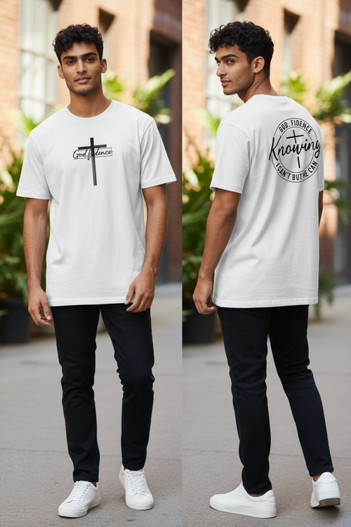 God-fidence cross logo on front along with a God-fidence knowing i can't but he can full circle logo on back